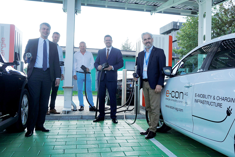 Die Fünf von der E-Tankstelle: Staatssekretär Steffen Bilger (v.l) weihte gemeinsam mit dem Unterallgäuer Landrat Alex Eder, Andreas Müller, Geschäftsführer Alois Müller GmbH & Airport Energie Management GmbH, dem Bundestagsabgeordneten Stephan Stracke und Flughafen Geschäftsführer Ralf Schmid die neue Ladestation am Airport Memmingen ein.