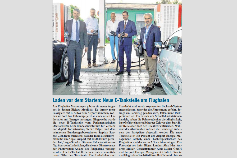 „Die Elektromobilität ist auf dem Vormarsch. Deshalb freut es mich sehr, dass der Allgäu Airport dieser Entwicklung nun mit einer solch modernen Anlage Rechnung trägt“, erklärte Staatssekretär Bilger. Gemeinsam mit dem Allgäuer Bundestagsabgeordneten Stephan Stracke (CSU) weihte er die Anlage ein. „Die Elektromobilität startet im Allgäu weiter durch. Dazu braucht es eine flächendeckende Ladeinfrastruktur. Ich freue mich sehr, dass der Bund diese zukunftsfähige Mobilität am Allgäu Airport mit 145.000 Euro gefördert hat,“ erläuterte Stracke.